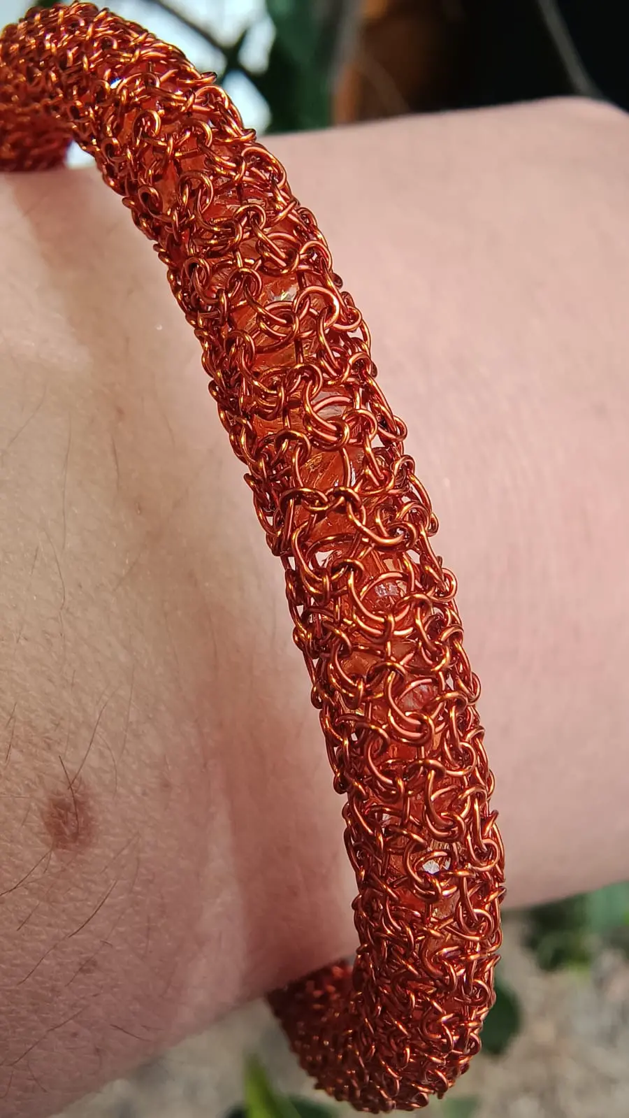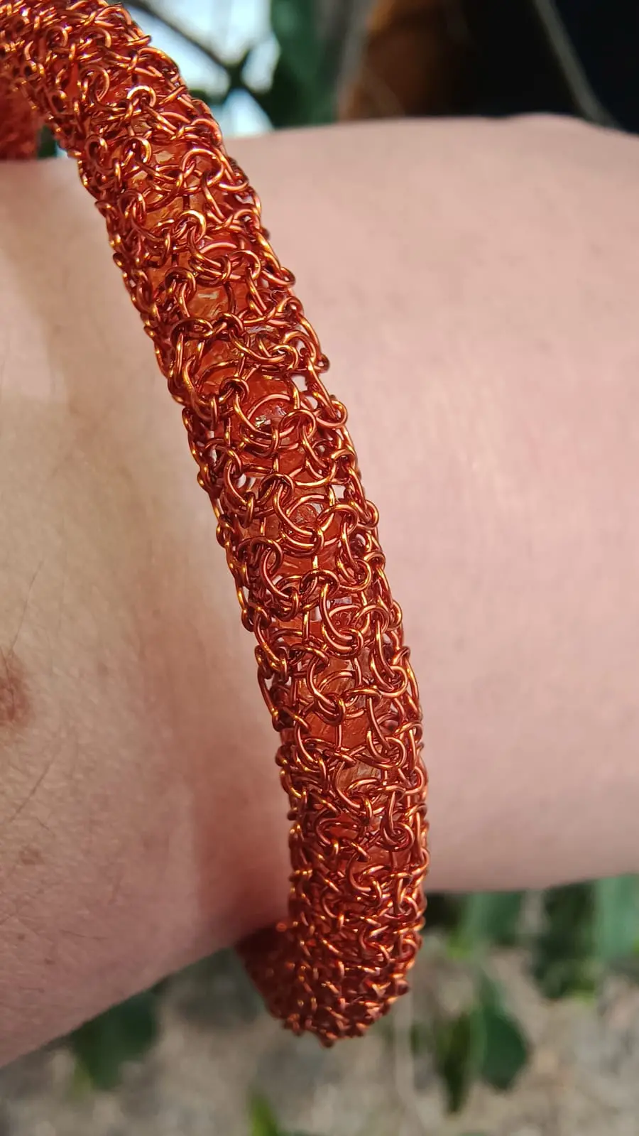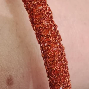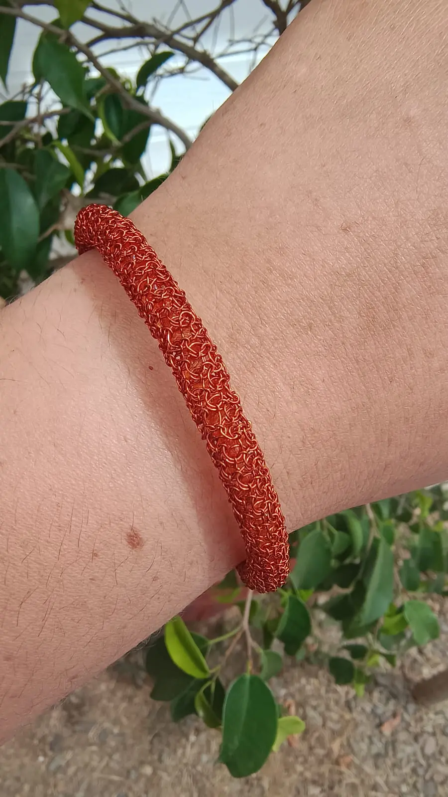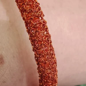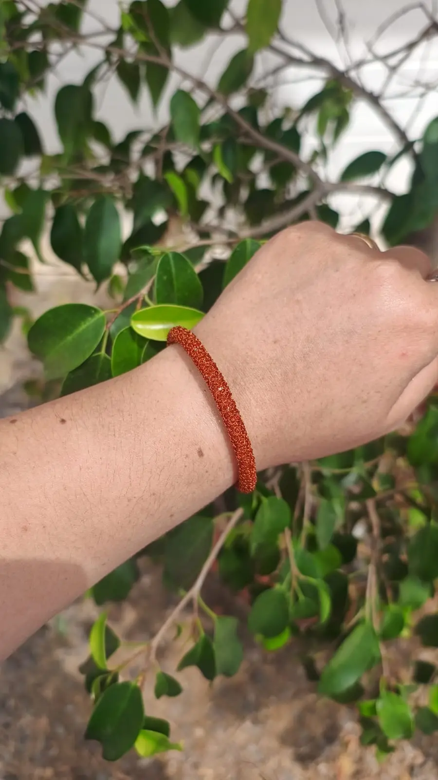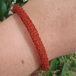 Cada pieza elaborada con la técnica de tejido peruano refleja dedicación y arte. Este trabajo se realiza a mano con una aguja de gancho, entrelazando delicadamente hilos de cobre bañado hasta formar una textura trenzada única.